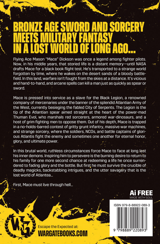 Mace is pressed into service as a slave for the Black Legion, a renowned company of mercenaries under the banner of the splendid Atlantian Army of the West, currently besieging the fabled City of Serpents. The Legion is the tip of the Atlantian spear aimed straight at the heart of the power-mad Thuman Evol, who marshals red sorcerers, armored war-dinosaurs, and a host of grim fighting men to oppose them. Out of his depth, Mace is trapped in a no-holds-barred contest of gritty grunt infantry, massive war machines, and strange sorcery, where the soldiers, NCOs, and battle captains of glorious Atlantis fight the enemy and sometimes one another for eternal honor, glory, and ultimate power.