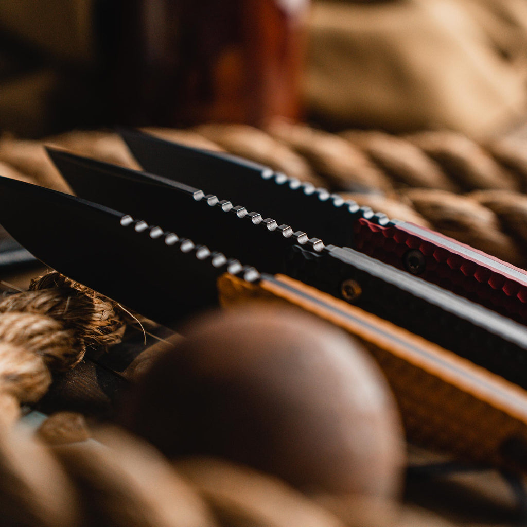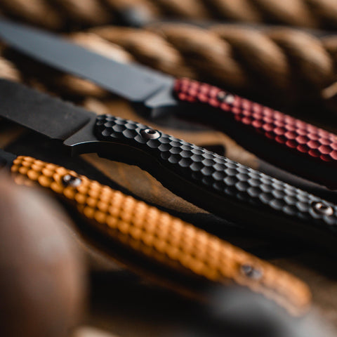 With an overall length of 8.5” and weight of 6.4 oz., the Mutiny was designed as a low-profile EDC tool and pays homage to the golden age of piracy, with some added modern flair. Made from CPM 154 steel, which offers better corrosion and wear resistance, this knife also features billet Aluminum 7075 scales that are 3D textured in a hexagonal pattern and provide additional grip on the high seas. Each handle scale is individually anodized leaving it with a premium color and finish. Additionally, each piece of hardware on The Mutiny is bronze PVD coated 303 stainless steel to ensure absolute structural integrity add value to your ship’s plunder!