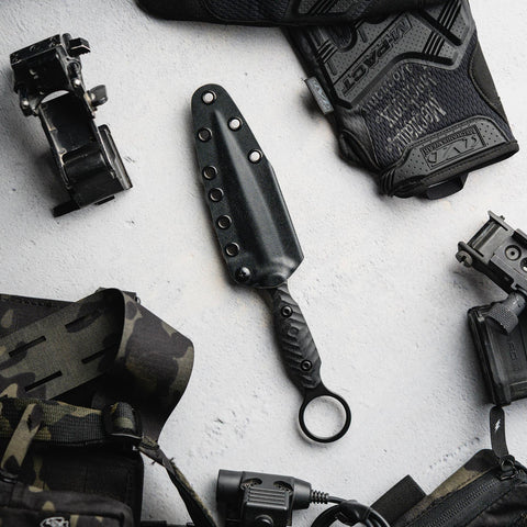 Made from CPM M4, the Specter R’s 4.25” blade is cloaked in KG Gunkote, giving it stealth finish. Available in Phantom Grey and SOCOM Black, each Specter R is entirely made here in San Diego, California by our skilled and talented manufacturing team. Every Specter R includes a DuoTone™ KYDEX® sheath, with easy retention adjustability and multiple friction offsets to eliminate blade rattle.