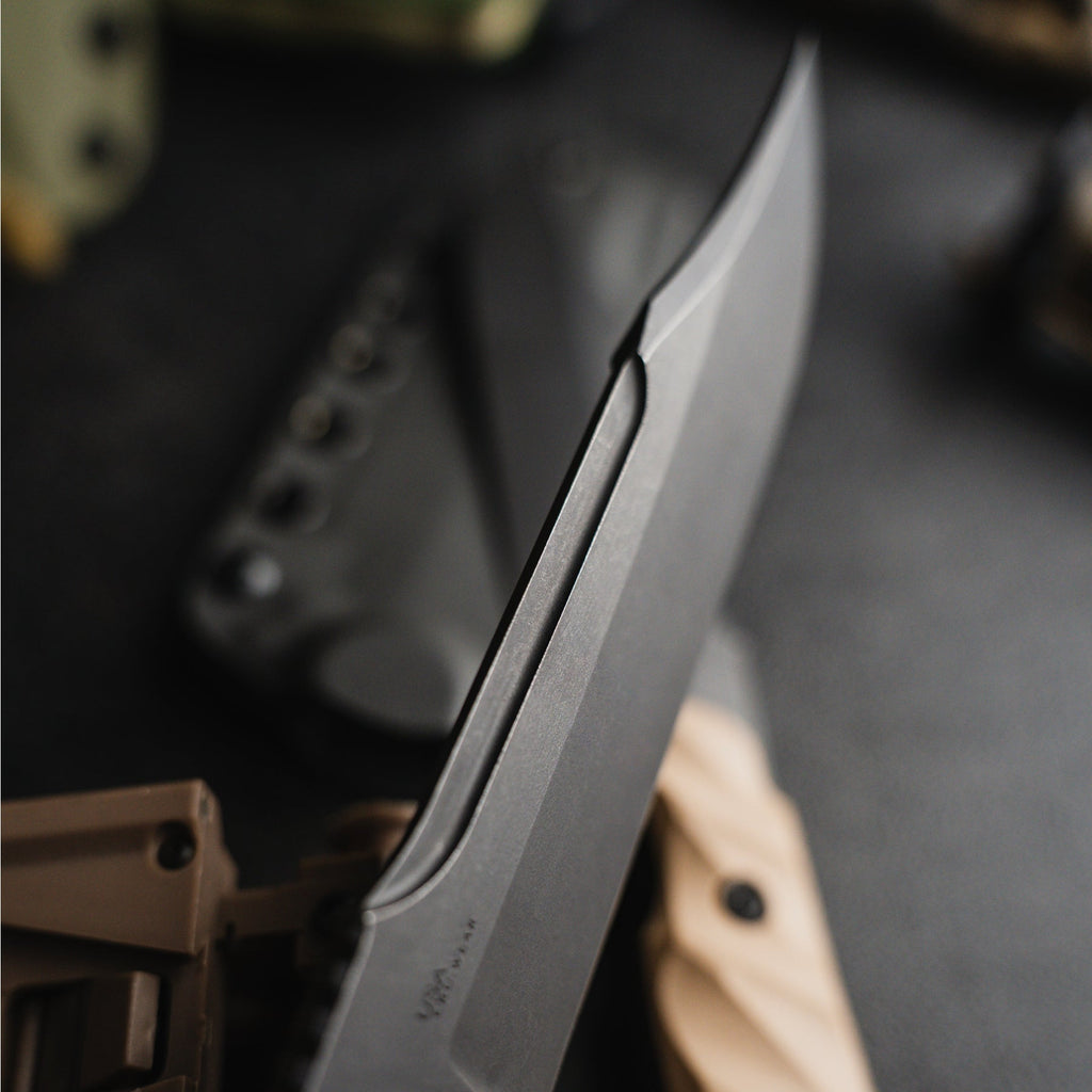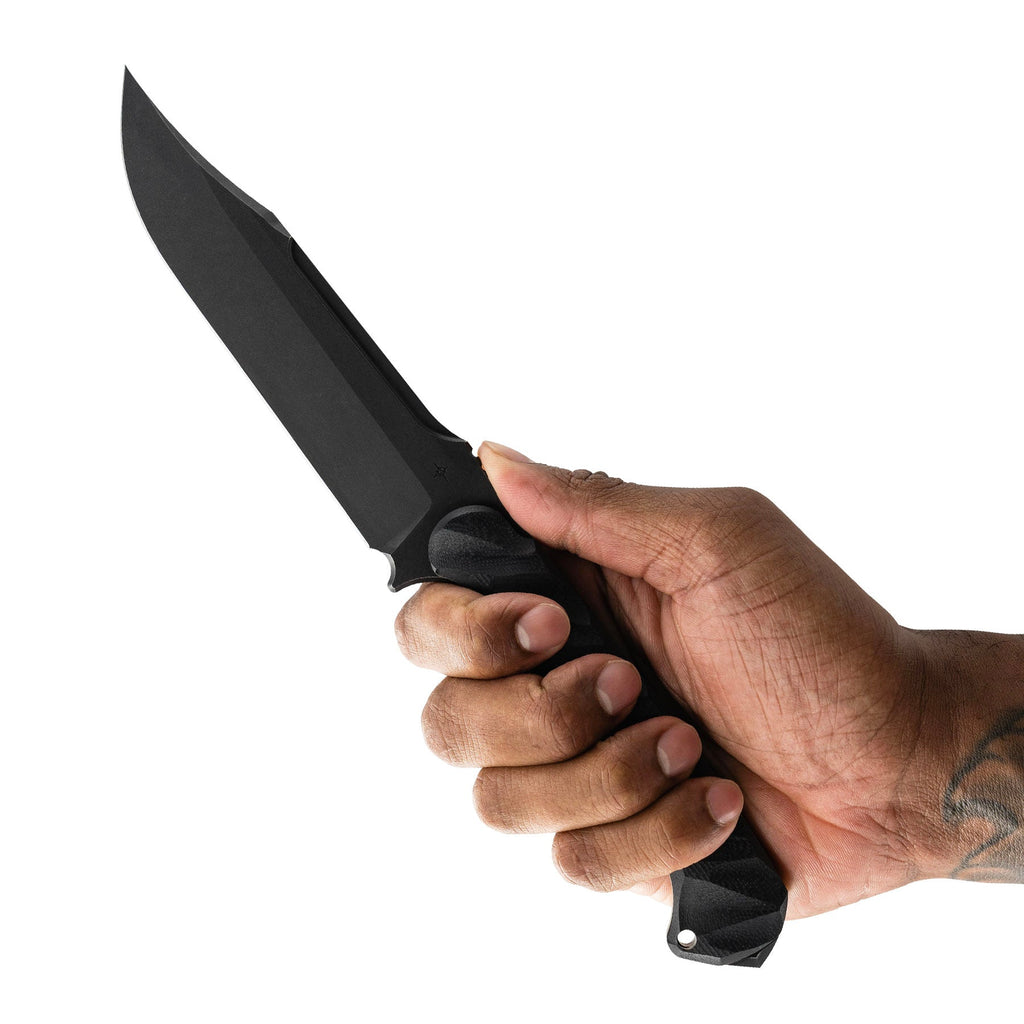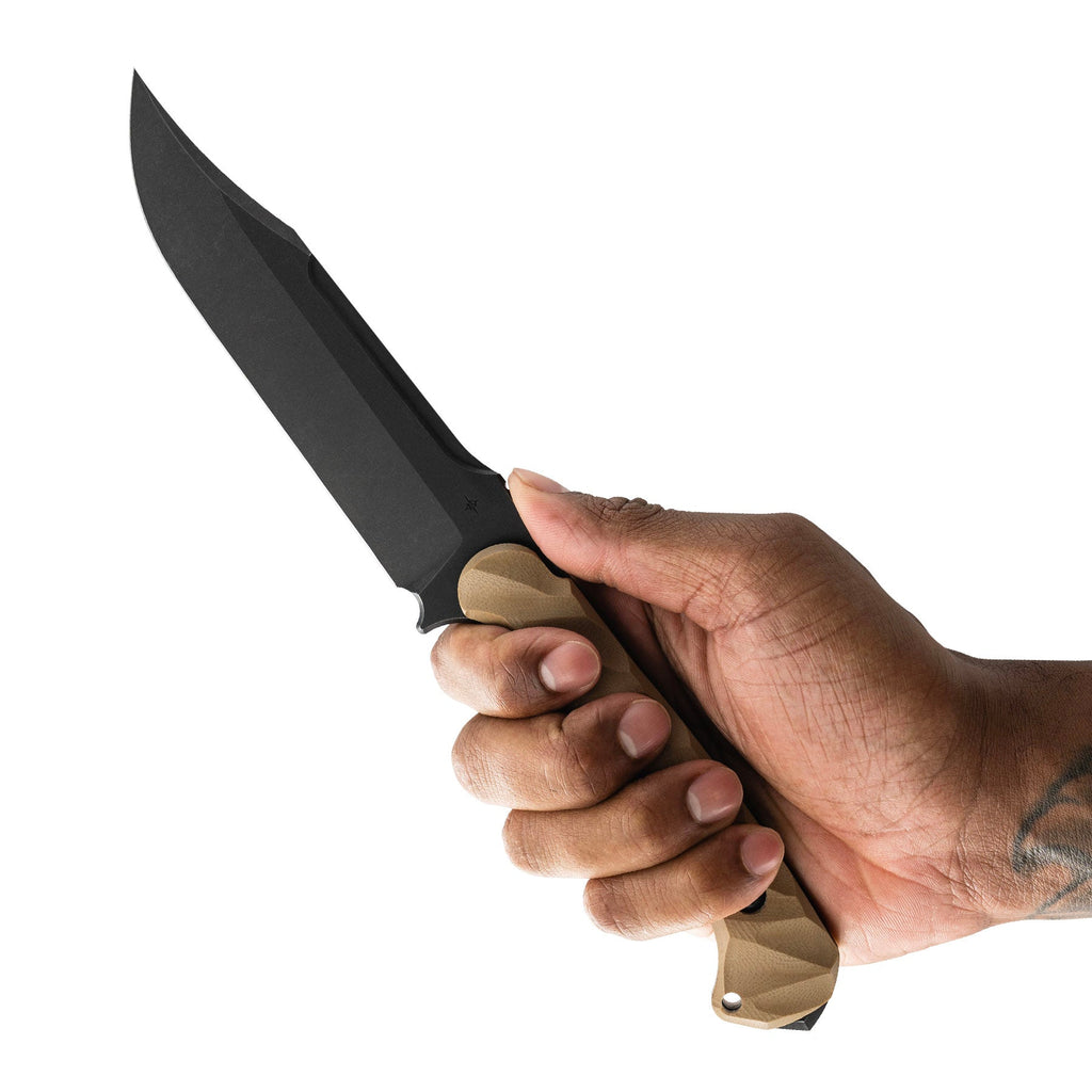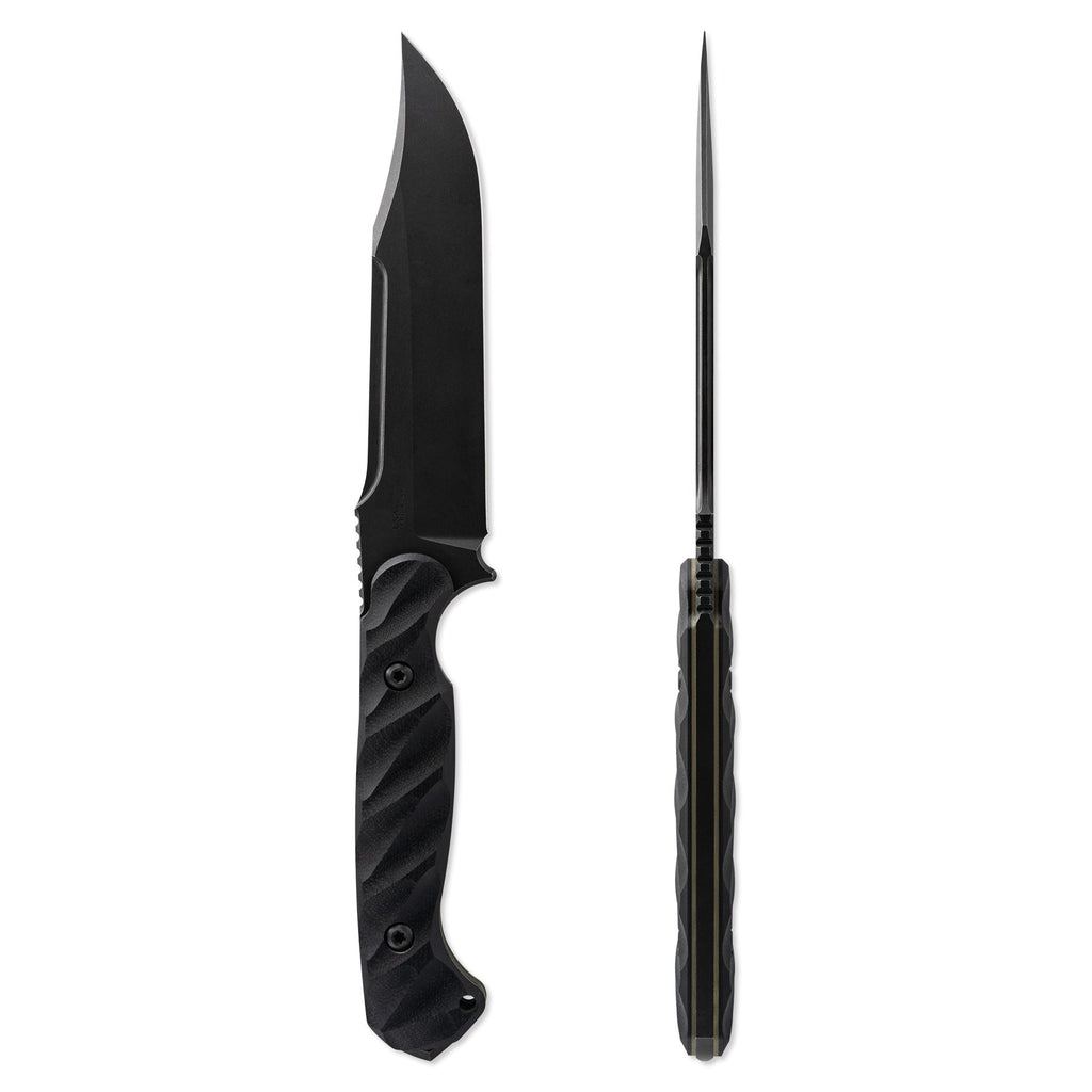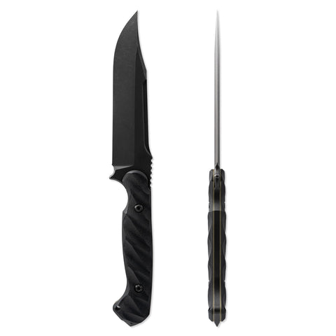 With an overall length of 10.875”, a blade thickness of 0.1875” and weighing in at 9.3 oz, the Valor makes for an incredibly durable, effective and versatile tool in the field. The Valor is designed with our War Wedge™ breaker on the back of the knife for blunt force when breaching or splitting. The G10 handle is carved in a 3D radial pattern, creating a belly in the center portion to add mass to the overall grip.