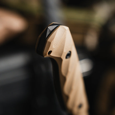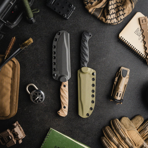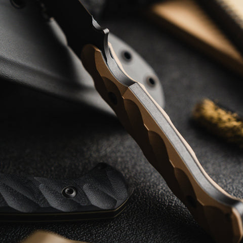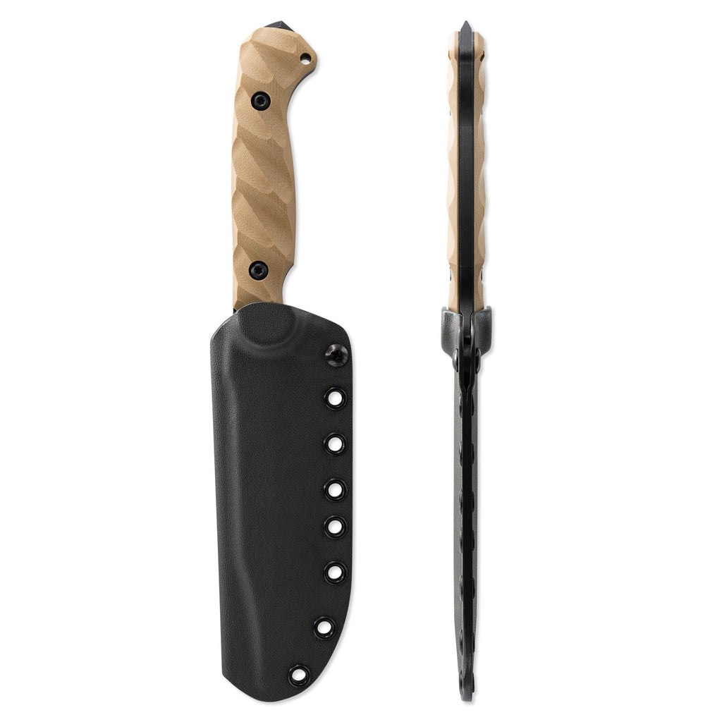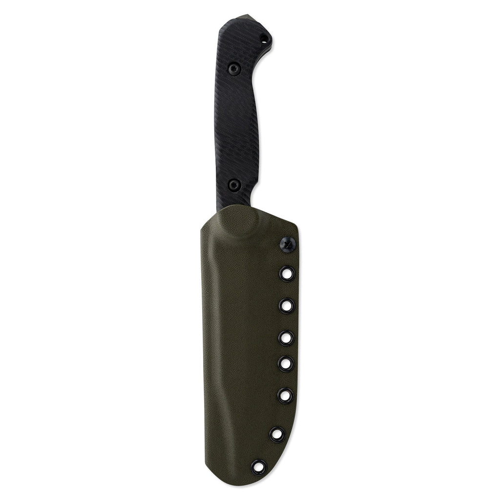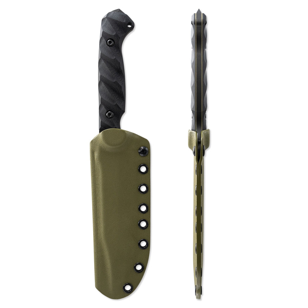 The CPM 3V blade is ground with a Hybrid Fuller™ to reduce the overall weight and bring symmetrical balance to the knife. The extra high flat ground bevel meets the swedge grind seamlessly, leading to the reinforced tip. The blade is assembled with our custom turned hardware made from 303 stainless steel and is fitted with a fold over FlexTech KYDEX® sheath, which accepts all Toor Knives mounts.
