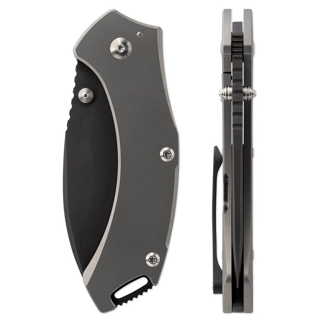 Additionally, a full titanium backspacer was added to greatly improve the rigidity of all the frame body screws and relieve the stress from traditional threaded standoffs. The Titanium backspacer is finished with a large loop featuring jimping for safety chords and lanyards.
